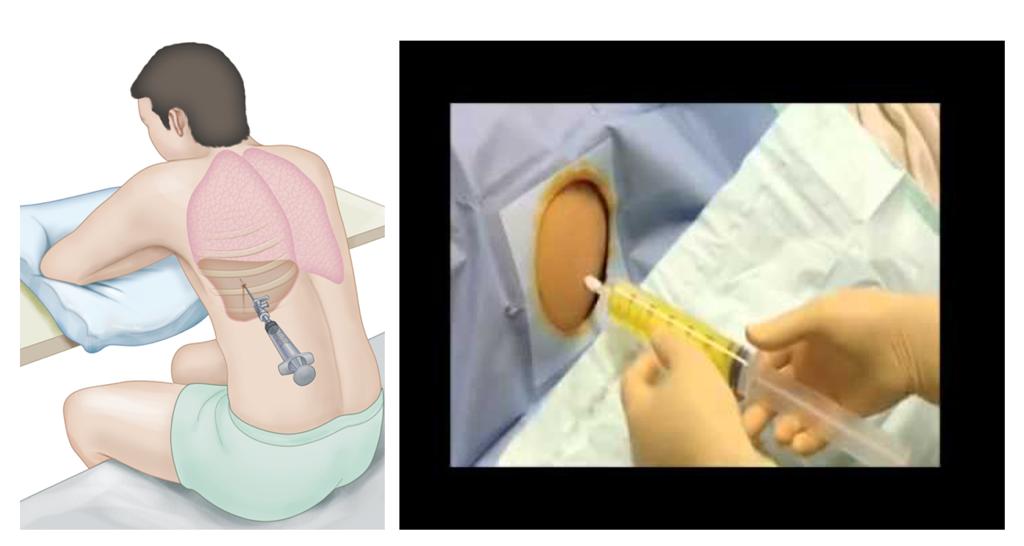 Esse procedimento consiste na retirada através de punção do acumulo de liquido na pleura sob anestesia local, com objetivo de aliviar excesso de liquido (derrame pleural volumoso) e coletar material para exames.